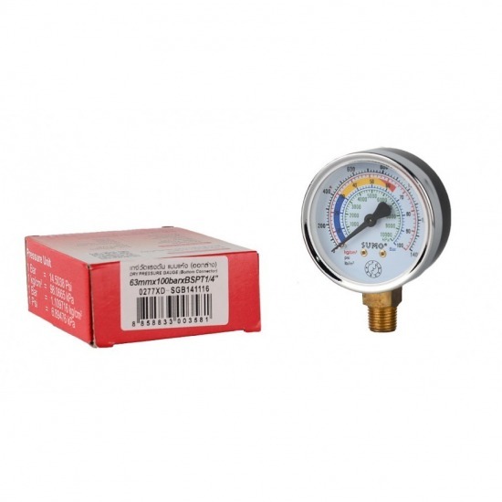 SUMO เกจวัดแรงดัน แบบแห้ง ออกล่าง ตัวเรือนผลิตจากเหล็ก ทนทาน หน้าปัดผลิตจาก โพลีคาร์บอเนต มีความแข็งมาก ทนทานจากรอยขีดข่วน เกลียวเชื่อมต่อด้านล่าง ผลิตจากทองเหลือง100% ทนทาน ใช้วัดค่าแรงดันน้ำ แก๊ส ลม หรือ น้ำมัน เหมาะกับงานอุตสาหกรรมทุกชนิด เช่นอุตสาหกรรอาหาร เคมี พลาสติก เป็นต้น สามารถนำไปใช้ได้ตามความต้องการ คุณสมบัติสินค้า เกจ์วัดแรงดัน แบบแห้ง เหมาะสำหรับงานวัดแรงดันทั่วไป  บอดี้เหล็ก  คำเตือน แถบฟ้า : คือช่วงแรงดันที่เหมาะสมในการใช้งาน แถบเหลือง : คือไม่ควรใช้แรงดันเกินแถบสีเหลือง แถบสีแดง : เป็นช่วงแรงดันที่จะทำให้เกจ์เสีย คำแนะนำ วิธีการเลือกใช้เกจ์ที่ถูกต้องคือ ต้องใช้เกจ์ขนาดแรงดัน ที่มากกว่า 3 เท่า ของแรงดันที่ต้องการใช้งาน  เช่น หากต้องการวัดแรงดันที่ 10 bar ต้องใช้เกจ์ที่ 30 bar     เกจวัดแรงดันแบบแห้ง SUMO เกจวัดแรงดันแบบแห้ง SUMO เป็นอุปกรณ์วัดแรงดัน ที่ใช้สำหรับงานระบบประปา ลม และอุตสาหกรรม   คุณสมบัติของ เกจวัดแรงดันแบบแห้ง SUMO ทนทาน ใช้งานได้ยาวนาน แม่นยำ วัดค่าแรงดันได้อย่างถูกต้อง ติดตั้งง่าย สะดวก รวดเร็ว มีหลายขนาด ให้เลือกตามการใช้งาน ราคาประหยัด เกจวัดแรงดันแบบแห้ง SUMO มีให้เลือกหลายรุ่น ดังนี้ รุ่น SUMO SD-63: หน้าปัดขนาด 63 มม. แรงดันสูงสุด 10 บาร์ รุ่น SUMO SD-100: หน้าปัดขนาด 100 มม. แรงดันสูงสุด 10 บาร์ รุ่น SUMO SD-150: หน้าปัดขนาด 150 มม. แรงดันสูงสุด 10 บาร์ วิธีการใช้งาน เกจวัดแรงดันแบบแห้ง SUMO เลือก เกจวัดแรงดัน ให้เหมาะกับการใช้งาน ติดตั้ง เกจวัดแรงดัน เข้ากับระบบ เปิดระบบ และอ่านค่าแรงดัน ข้อควรระวัง ควรเลือก เกจวัดแรงดัน ที่มีขนาด และแรงดันสูงสุด เหมาะกับการใช้งาน ควรติดตั้ง เกจวัดแรงดัน ในตำแหน่งที่ปลอดภัย ควรอ่านค่าแรงดัน ด้วยความระมัดระวัง เกจวัดแรงดันแบบแห้ง SUMO เป็นอุปกรณ์วัดแรงดัน ที่ใช้งานง่าย สะดวก รวดเร็ว เหมาะกับงานระบบประปา ลม และอุตสาหกรรม